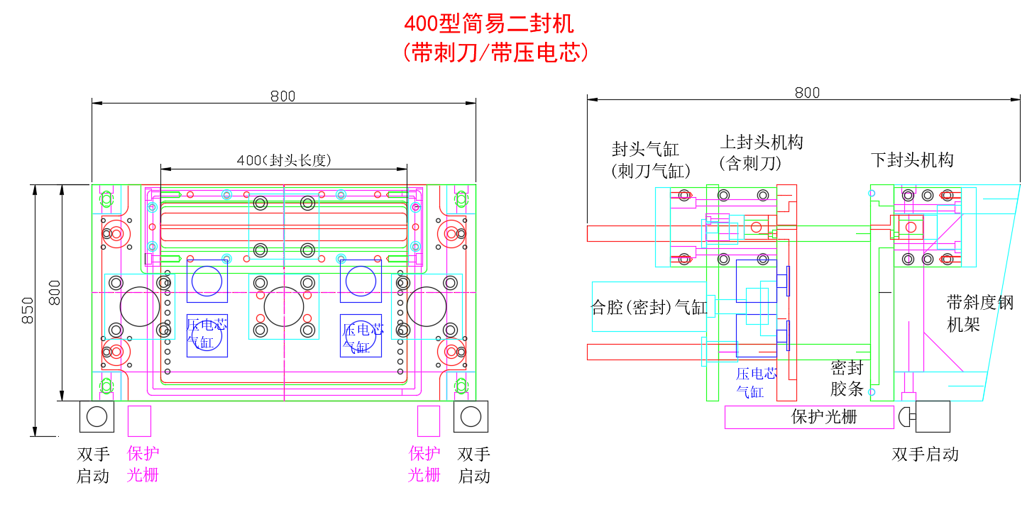 工作原理:該設(shè)備由四個機構(gòu)組成,分別是電芯放置定位機構(gòu),上下合腔刺刀剌穿機構(gòu),抽真空壓電芯機構(gòu),熱封機構(gòu),人工放料到電芯校正定位后,雙啟手按動雙按鈕開關(guān),設(shè)備運行,上下合腔完成刺刀剌穿氣袋口,再開始抽真空及壓緊電芯,真空達到預(yù)定值后再繼抽設(shè)定時間完成后,上封頭下壓熱封,充氮氣泄圧合腔分開,取出電芯的半自動設(shè)備。