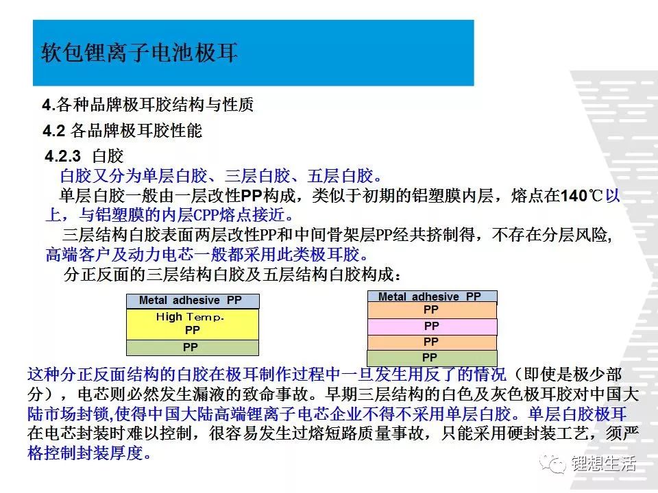 黃膠極耳有分層的危險。但黃膠極耳的封裝條件比白膠容易調(diào)節(jié)。前期日本極耳膠供應(yīng)商也提到黃膠的不足,表現(xiàn)為3點: