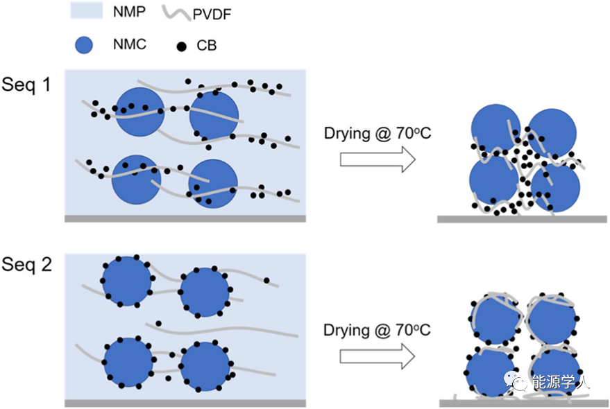因此,順序1制成的漿料的“強(qiáng)度”由PVDF鏈的纏結(jié)和CB的填充效應(yīng)共同提供。順序2制成的漿料的“強(qiáng)度”主要由PVDF鏈的纏結(jié)提供。導(dǎo)致順序2制成的漿料流動性較好。在干燥過程中,使用順序1制得的漿料隨著NMP的蒸發(fā),CB納米顆粒被捕集在PVDF聚合物基質(zhì)中,形成了填充NMC顆粒之間空間的多孔CB/PVDF簇。在干燥使用順序2制得的漿料時,附著在NMC顆粒上的CB納米顆粒會吸收PVDF,從而在NMC顆粒上形成致密的CB/PVDF層。