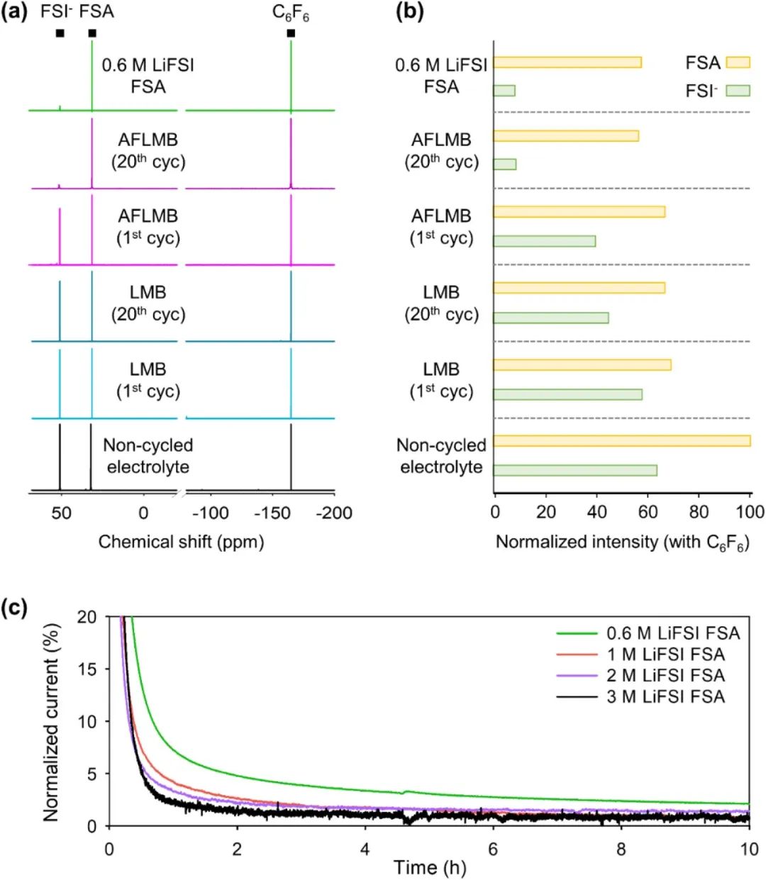 圖3. (a) 0.6 M LiFSI FSA 電解質(zhì)、非循環(huán)電解質(zhì)、AFLMB 和 LMB 與 3 M LiFSI FSA 電解質(zhì)經(jīng)過 1 個和 20 個循環(huán)后的 19F NMR 光譜。(b) 19F NMR 光譜中 FSI 陰離子和 FSA 溶劑峰的綜合面積,使用 (a) 19F NMR 光譜中 C6F6 的內(nèi)部參考進(jìn)行歸一化。(c) Cu/NCM811 電池在 25 °C預(yù)循環(huán)后,在 4.25 V 下進(jìn)行的電化學(xué)浮動測試。