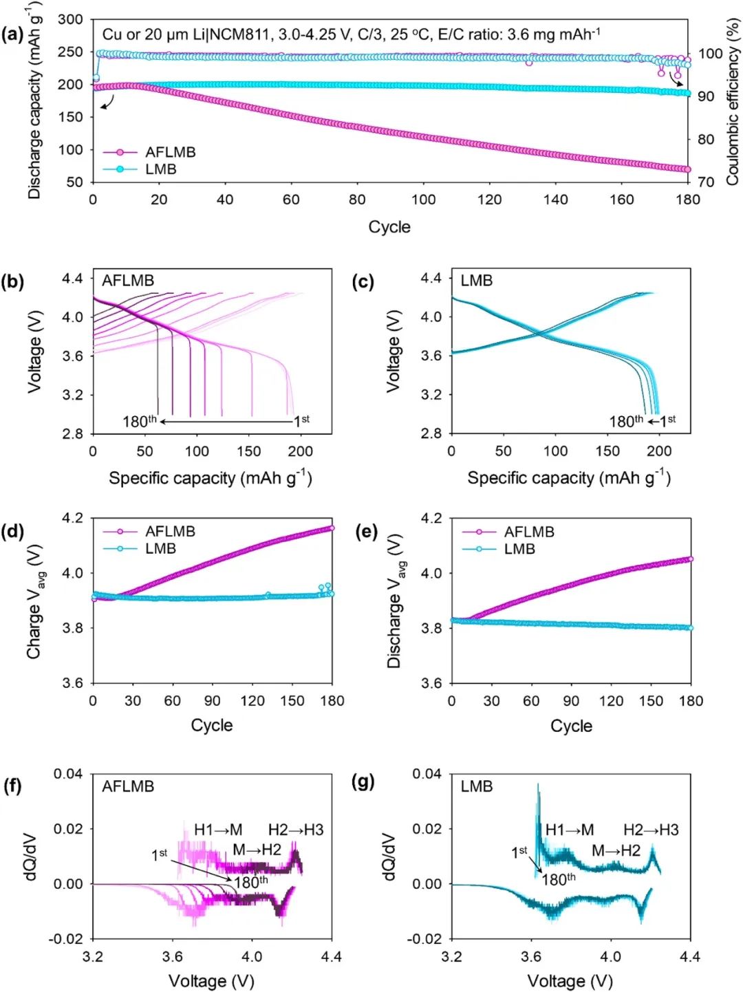 圖2. (a) AFLMB 和 LMB 在紐扣電池中的循環(huán)穩(wěn)定性。使用 3 M LiFSI FSA 電解質(zhì)的 AFLMB 和 LMB 在循環(huán)過程中(b)的電壓曲線。AFLMB 和 LMB (d) 充電和 (e) 放電曲線的平均電壓。(f) AFLMB 和 (g) LMB 超過 180 個循環(huán)的 dQ/dV 圖。