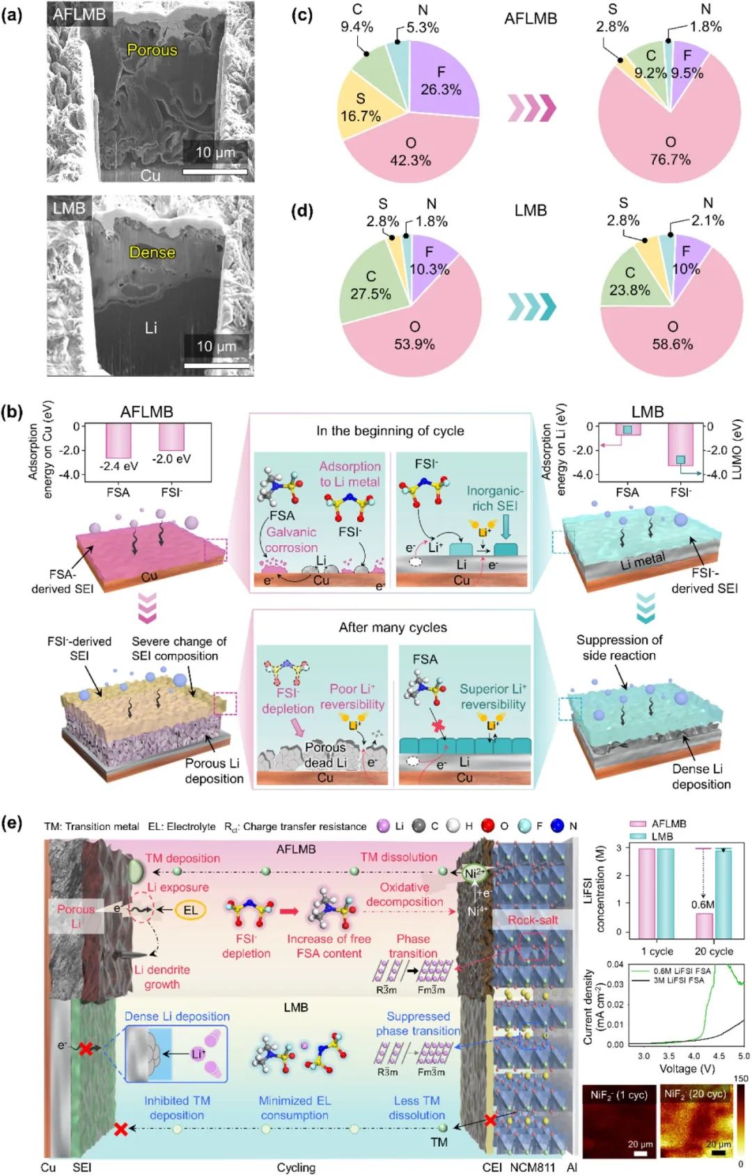 【結(jié)果與討論】圖1. (a) 銅箔和鋰金屬陽極鍍鋰后的截面 SEM 圖。(b) 根據(jù)最低未占分子軌道(LUMO)能級以及 FSA 溶劑和 FSI-陰離子在 Cu 和鋰金屬上的吸附傾向的結(jié)果,Cu 銅箔和鋰金屬陽極在第一個周期鍍鋰前后 SEI 成分的變化示意圖。XPS 分析得出的原子百分比:(c) AFLMB 中的銅箔和 (d) LMB 中的鋰金屬陽極,在 AFLMB 首次充電期間,鍍鋰前充電至 3.7 V 和鍍鋰后充電至 4.25 V 時的對比。(e)通過比較分析(循環(huán)過程中 LiFSI 濃度的變化、LSV 和 TOF-SIMS 圖像)發(fā)現(xiàn),使用 3 M LiFSI FSA 電解液的 AFLMB 和 LMB 的界面現(xiàn)象存在差異。