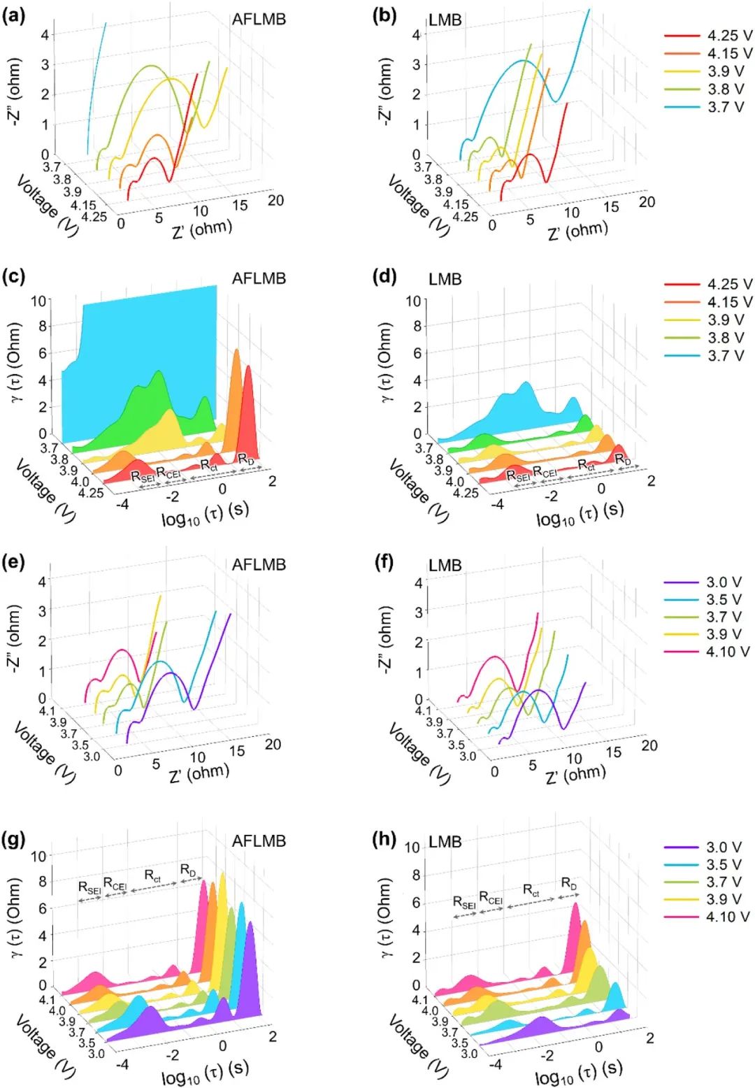 圖6. 不同充電電壓下 (a) AFLMB 和 (b) LMB 的奈奎斯特圖。根據(jù)(c) AFLMB 和 (d) LMB 在預(yù)循環(huán)充電期間的奈奎斯特圖轉(zhuǎn)換的 DRT 曲線。不同放電電壓下 (e) AFLMB 和 (f) LMB 的奈奎斯特圖。根據(jù)預(yù)循環(huán)放電過程中 (g) AFLMB 和 (h) LMB 的奈奎斯特圖轉(zhuǎn)換的 DRT 曲線。