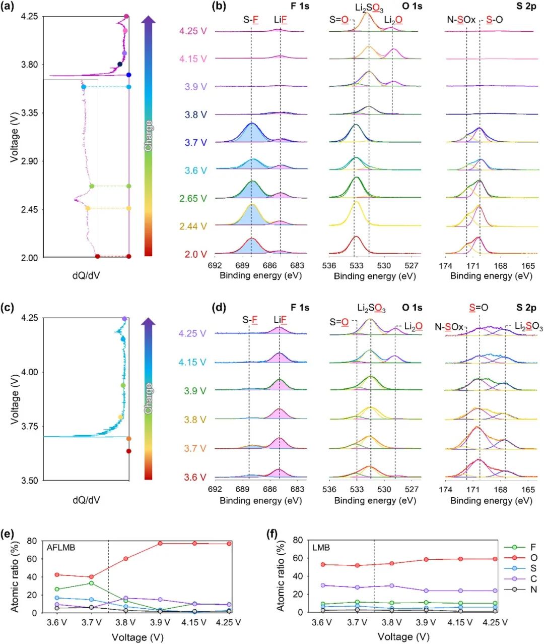 圖4. (a) C/10 預(yù)循環(huán)充電期間 AFLMB 的 dQ/dV 圖。插圖表示與 SEI 形成相對應(yīng)的 dQ/dV 峰放大區(qū)域。(b) AFLMB 中的銅箔在不同帶電狀態(tài)下的 F 1s、O 1s 和 S 2p XPS 結(jié)果。(c) C/10 預(yù)循環(huán)充電期間 LMB 的 dQ/dV 曲線。(d) LMB 中的鋰金屬陽極在不同充電狀態(tài)下的 F 1s、O 1s 和 S 2p XPS 結(jié)果。XPS 分析得出的 (e) 從 AFLMB 中提取的銅箔和 (f) 從 LMB 中提取的鋰金屬陽極在不同帶電狀態(tài)下的界面層原子比。