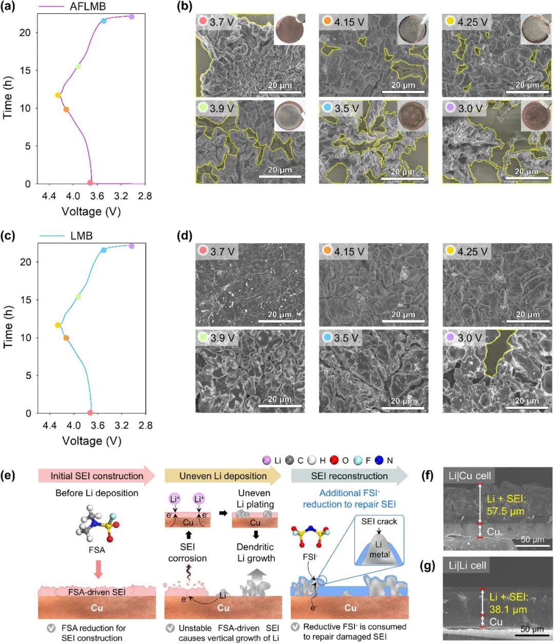 在預(yù)循環(huán)充電過程中,銅基底表面的鋰沉積呈現(xiàn)不均勻現(xiàn)象,即使在4.25 V充電時也未能完全覆蓋銅箔,而在放電過程中鋰的剝離同樣不均勻,形成樹枝狀形貌(圖5a、b)。相比之下,鋰金屬陽極的SEI則確保了鋰沉積的均勻性(圖5c、d)。在3.0 V放電時的形態(tài),發(fā)現(xiàn)LMB中的SEI產(chǎn)生的樹枝狀形態(tài)較少。為探討SEI與鋰金屬接觸時的穩(wěn)定性,將AFLMB和LMB在室溫下存放4天。結(jié)果顯示,與LMB相比,AFLMB中由FSA驅(qū)動的SEI阻抗迅速增加,這歸因于鋰沉積過程中SEI的成分變化以及電化學(xué)腐蝕導(dǎo)致的SEI重建。此外,暴露的銅表面可能導(dǎo)致樹枝狀鋰沉積(圖5e)。對比鋰/銅電池與鋰/鋰電池中鋰沉積的厚度,鋰/鋰電池上的鋰沉積層表現(xiàn)為薄而致密,幾乎無明顯空隙(見圖5f),而鋰/銅電池上的鋰沉積層則顯得厚而不致密(見圖5g)。