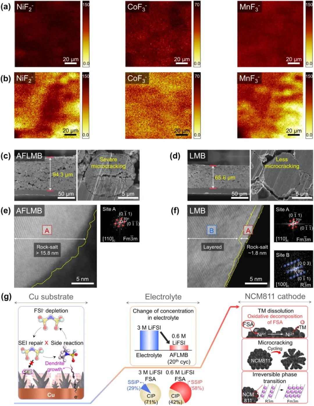 圖7. 在 C/3 和 25 ℃ 下分別經(jīng)過 (a) 20 次和 (b) 100 次循環(huán)后,AFLMB 中銅上的 NiF2-、CoF3- 和 MnF3-的 TOF-SIMS 化學(xué)圖譜。在 C/3 和 25 °C 下循環(huán) 100 次后,從 (c) AFLMB 和 (d) LMB 中提取的 NCM811 陰極的截面 SEM 圖像。在 C/3 和 25 °C 下循環(huán) 100 次后,從含有 3 M LiFSI FSA 電解液的 (e) AFLMB 和 (f) LMB 中提取的 NCM811 陰極的 STEM 圖像和 FFT 圖樣。(g) FSI 陰離子耗竭和 SEI 降解對 NCM811 陰極的交叉影響。